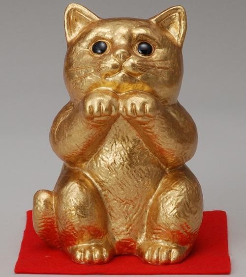 | おねだりをしているようなかわいいしぐさの猫です。型で成形し、素焼きし、釉薬をかけて本焼きをしてから、金色を塗り、低温で焼成して色を定着させます。金色商品は屋内で飾っていただきます。そのために毛氈を付けてあります(水気により色が剥げる場合があります)。この表情で見つめられると思わず笑顔になります。笑う門には福来る!! |