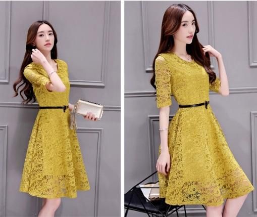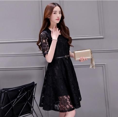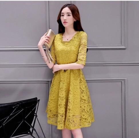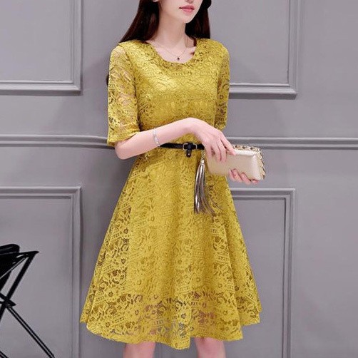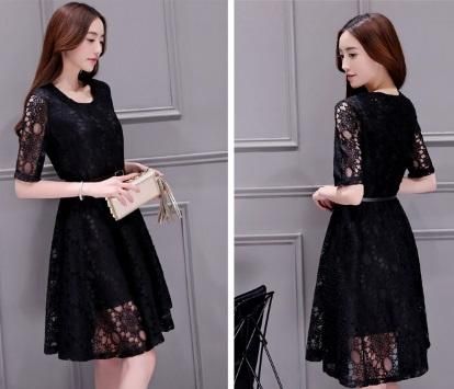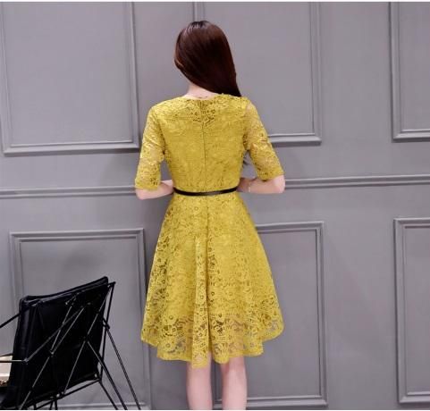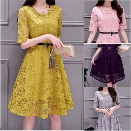 ひざ丈フレア総レースパーティードレス。