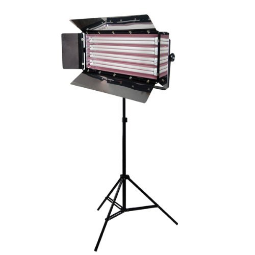 What's in the box: 1 x 4-Bank Fluorescent light panel with barndoor 4 x 55W 4 Pin Type Light Bulbs Description: Equivalent: Total 1100 Watt of output Supply Voltage:110v 60Hz Size: 14.7"W x 23"H x 3.5"D Bank control ON/OFF switch on the body. (One switch control two bank). Four-Way Barndoors 10,000 Hour Lamp Life Color Temperature: 5400K Length: 21" Shape Single Tube 4-PIN Wattage (W) 55W