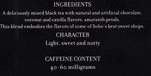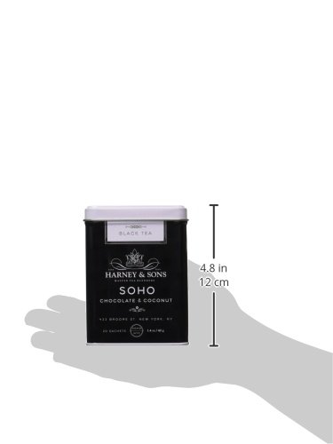 -. Binding : Misc. -. Brand : Harney & Sons -. EAN : 0636046306006 -. Feature : The newest tea from the Master Tea Blenders at Harney & Sons / Created by Emeric Harney in honor of their new shop in Manhattan's fashionable SoHo neighborhood / Black Tea flavored with the delicious tastes of Chocolate and Coconut / Light, sweet and nutty flavor / Each collectible tin contains 20 Tea Sachets -. Label : Harney & Sons -. Manufacturer : Harney & Sons -. MPN : H-001-0033 -. PackageQuantity : 1 -. PartNumber : H-001-0033 -. ProductGroup : Grocery -. ProductTypeName : GROCERY -. Publisher : Harney & Sons -. Studio : Harney & Sons -. Title : Harney & Sons SoHo Chocolate Coconut Tea - 20 Count Sachet Tin -. UPC : 636046306006