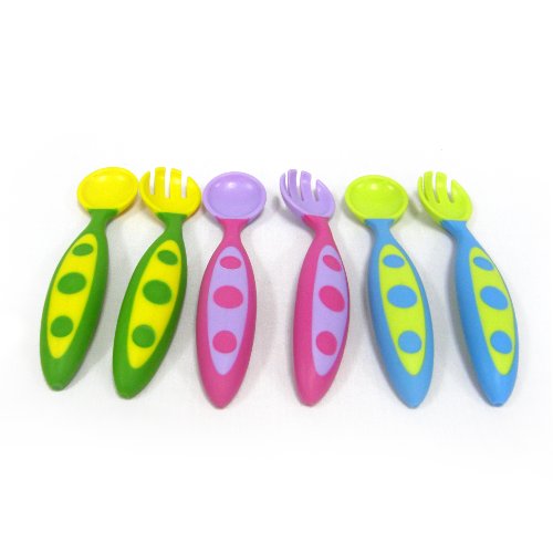 -. Feature : Bends to fit any grip / Soft easy grasp handles / Spoon has a wide, deep bowl, and fork features rounded tines to encourage self feeding success / This listing is for one set only. Colors vary. / For 9 months of age or older