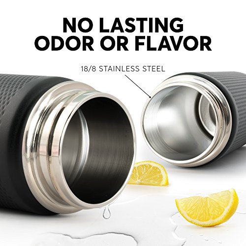 SCRATCH-RESISTANT FOOD GRADE STEEL. Bottle never retains odor or flavor and extra-durable powder coated finish stands up to drops, scratches and impacts