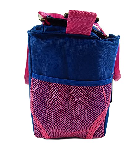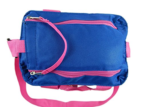 Dual zippered top with additional hook and loop closure, double handles plus additional strong woven shoulder strap 1 1/2 inches wide with a 10" to 21" drop.
