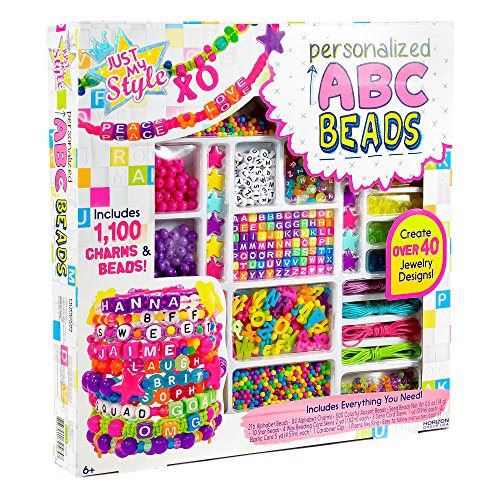 Spell it out and express yourself with the Just My Style ABC beads! personalize your style and create over 40 different jewelry designs to wear and share. With 1,100 vibrant charms and beads to mix and match, your creations will compliment any style! weave, knot and braid different cordings to add fun patterns and textures to your jewelry. Make bracelets, keychains, necklaces and more. Perfect for a sleepover, birthday party or gift! ideal for ages 6 years and up.Feature