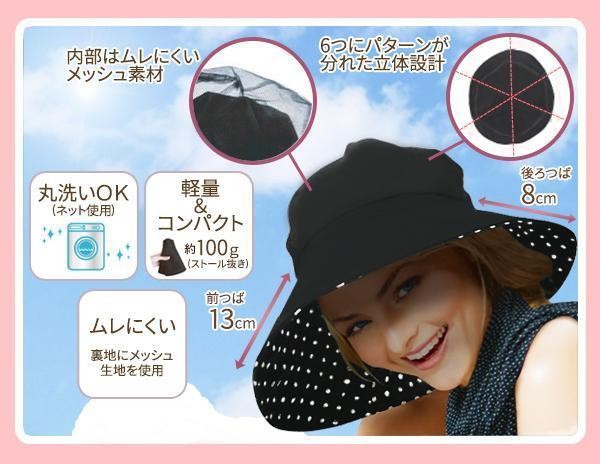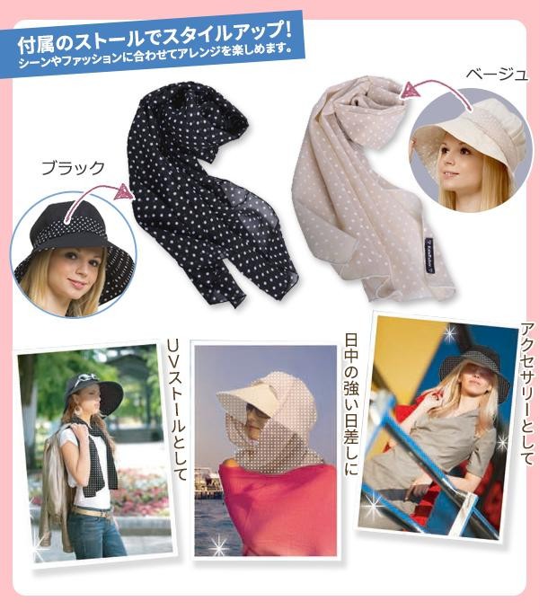 | 仕様 | UVカット率:99%以上(つば部分) 洗濯機使用可(ネット使用) ストール付き |