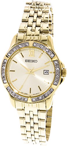 Gold-tone stainless steel case with a gold-tone stainless steel bracelet. Fixed gold-tone crystal-set bezel. Champagne dial with gold-tone hands and index and Roman numeral hour markers. Dial Type: Analog. Date display at the 3 o'clock position. Quartz movement. Scratch resistant hardlex crystal. Case size: 28 mm. Round case shape. Deployment clasp. Water resistant at 30 meters / 100 feet. Functions: date, hour, minute, second. Dress watch style. Seiko Champagne Dial Gold-tone Stainless Steel Ladies Watch SUR728.