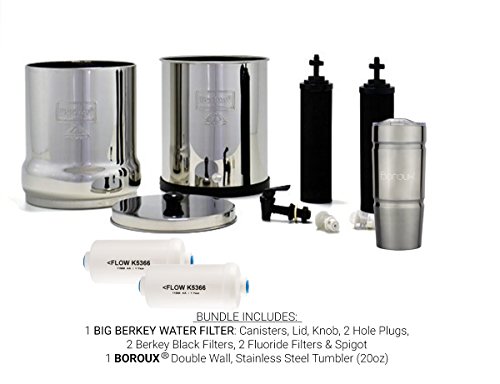 - BERKEY FILTER BUNDLE INCLUDES: 1 Big Berkey System 2.25 GALLON CAPACITY (stainless steel water filter) with 2 Black Berkey Purification Elements (Powerful Water Filters) and two Fluoride Filters Bundled with 1 Boroux 20 oz Stainless Steel Double Wall insulated Tumbler cup. All parts and pieces are BPA free. BIG BERKEY IS THE MOST POPULAR BERKEY WATER FILTER SYSTEM AS IT IS IDEAL FOR FAMILIES 3+ people