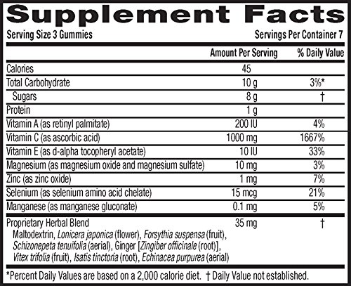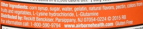 Studio : Reckitt Benckiser Publisher : Reckitt Benckiser Binding : Grocery Product Description Airborne Immune Support Gummies supplements provide real immune support in a delicious, and easy-to-take gummy form. Each serving (3 gummies) delivers a blast of 1000 mg of Vitamin C plus 9 other immune system supporting vitamins, minerals, and herbs, including Echinacea, ginger, and other herbal extracts from whole plant materials.* Adults and Children 14 years and older, chew 3 gummies thoroughly before swallowing. Repeat as necessary up to 3X per day, no more than 9 gummies per day. *These Statements have not been evaluated by the Food and Drug Administration. This product is not intended to diagnose, treat, cure or prevent any disease. 0
