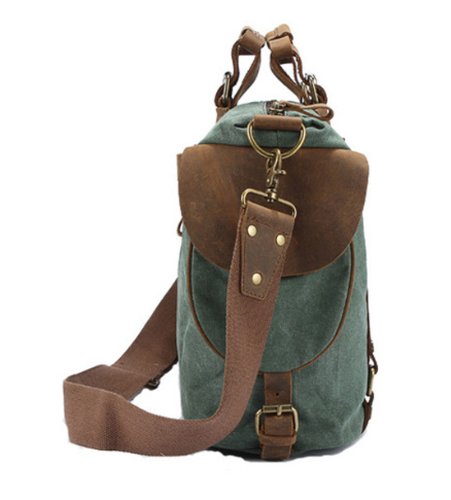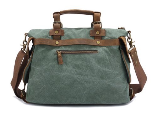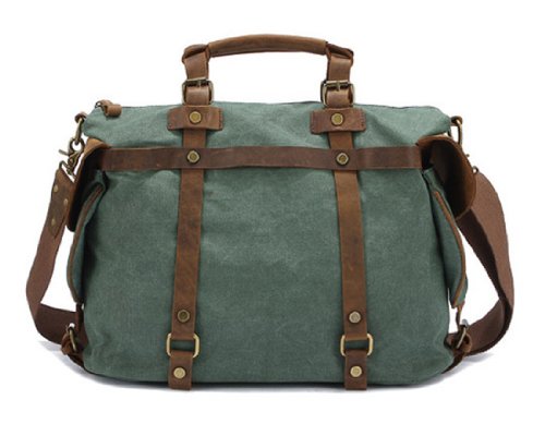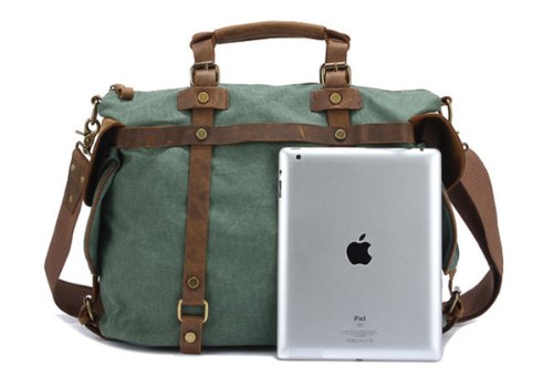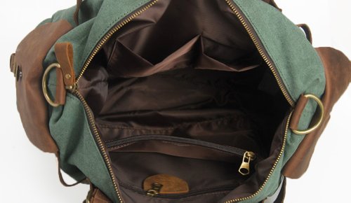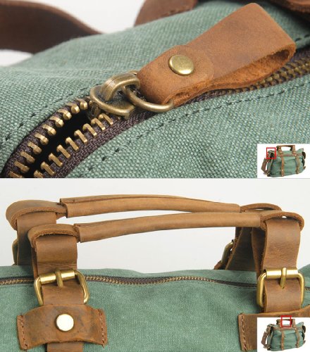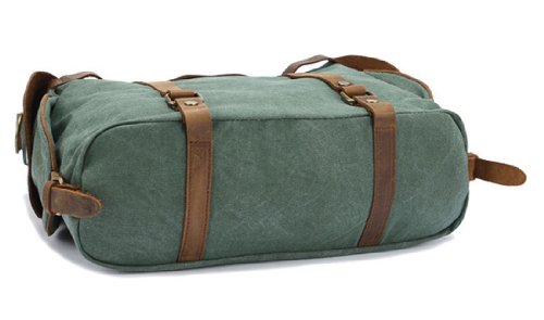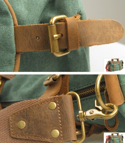 - Feature : Made by high quality canvas and Genuine cow leather / Dual leather straps with adjustment buckles, antique finish brass metal buckles / Interior zip, wall and cell phone pockets. Exterior pocket and 2 side pockets / Overall dimension: Approx. 16.5"L x 13.0"H x 5.9" W(Large Size) / Fit 14" laptop, A4 magazine etc.