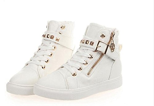 -. Feature : 大人かっこいいハイカットスニーカー☆サイドジップで着脱楽チン。タウンユースにぴったり!ゴールドのスタッズベルト、ジップ部分にはスカルのチャームで他にはないデザイン♪白一色にゴールドの金具が映えます、何にでも合わせやすい! / 可愛くもかっこよくも見せてくれる、主役級のスニーカーです!ジュニアサイズからの展開!お子様~大人まで幅広く履いて頂けます。 / サイズ:21.5~24.5cm 色:白・ホワイト お色違いのブラック・デニム地ブルー、花柄、ヒョウ柄 / 素材 甲・かかと部分:合皮、その他:キャンバス ソール:ゴム ソールの高さ:3cm ソール~ハイカット部分までの高さ:15cm 重さ:片足307g
