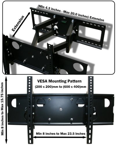 -. Feature : DESCRIPTION: Universal Dual Arm Full Motion TV Wall Mount for LCD LED Plasma (Max 165 lbs, 32 to 65 inch)TV's / SPECIFICATIONS: **Steel Construction** **Maximum Weight 165 lbs** **Minimum VESA (200x200)mm** **Maximum VESA (600x400)** **Minimum Extension 4.3 inches** **Maximum Extension 20.0 inches** **Tilt Range +15 to -15 degrees** **Swivel Range +/- 90 degrees** **RoHS Compliant** / SHIPPING: This item ships by FedEx Delivery time is usually (3 to 6) business days from purchase date. Sorry no PO Boxes / RETURNS: ShopBox items that are purchased may be returned within 60 days of receiving them for either a refund, replacement, or a exchange. ShopBox items can be replaced or exchanged (pending product availability). If there's an error on our part related to your order, we will issue a credit for your order and any applicable shipping. Otherwise ShopBox is not responsible for return shipping cost. Please contact us through Amazon before any returns are made. / COMPATIBILITY: **Fits these VESA mounting patterns: *(200x200)mm = (8x8)inches* *(300x200)mm = (12x8)inches* *(600x200)mm = (23.5x8)inches* *(300x300)mm = (12x12)inches* *(400x300)mm = (15.75x12)inches* *(500x300)mm = (19.75x12)inches* *(600x300)mm = (23.5x12)inches* *(400x400)mm = (15.75x15.75)inches* *(500x400)mm = (19.75x16.75)inches* *(600x400)mm = (23.5x15.75)inches** **Compatible TV Brands:** *Coby, Dynex, Element, Emerson, Haier, Hitachi, Insignia, JVC, LG, Magnavox, Mitsubishi (Unisen), NEC, Panasonic (Viera), Philips, Polaroid, RCA, Samsung, Sanyo, Sharp (Aquos), Sony (Bravia), Sylvania, Toshiba, Viewsonic, Vizio, Westinghouse** ****IMPORTANT!**** Please note that the screen sizes listed are only approximations. The VESA pattern used to mount the display and the weight of the display are the P.R.Imary indicators of whether a given display and mount are compatible. Please check the VESA pattern listed in your product manual to ensure that this mount will work with your display*
