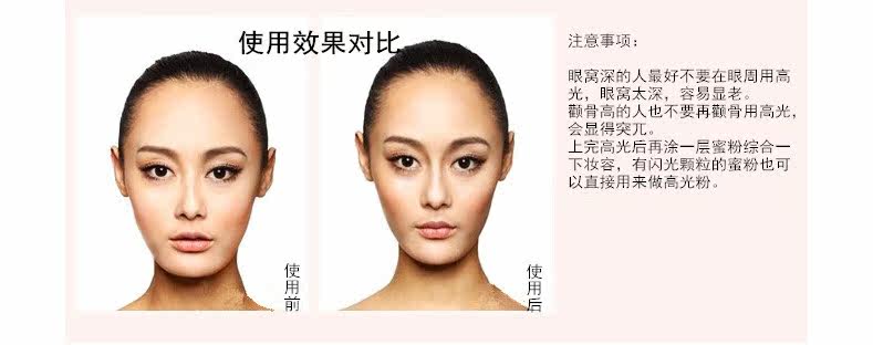 双色修容饼,白色可做提亮,咖啡色做暗影(收小脸部轮廓)就可变成小脸美人哦~ 它是专业化妆师最必备的一款化妆品! 许多明星拍影视剧时,都用它来修饰两侧的轮廓~圆脸也能变成瓜子脸~