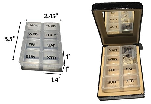 Secure your pills with A STYLISH & DISCREET MANNER. Organize them all in seconds for the whole week. The fashion smart pill case helps you keep track of your pills. Inner container has eight compartments to hold a week's worth...and then some extra!. This fashion pill container made with Crocodile PP/PVC material is the perfect traveling companion comes with mirror.