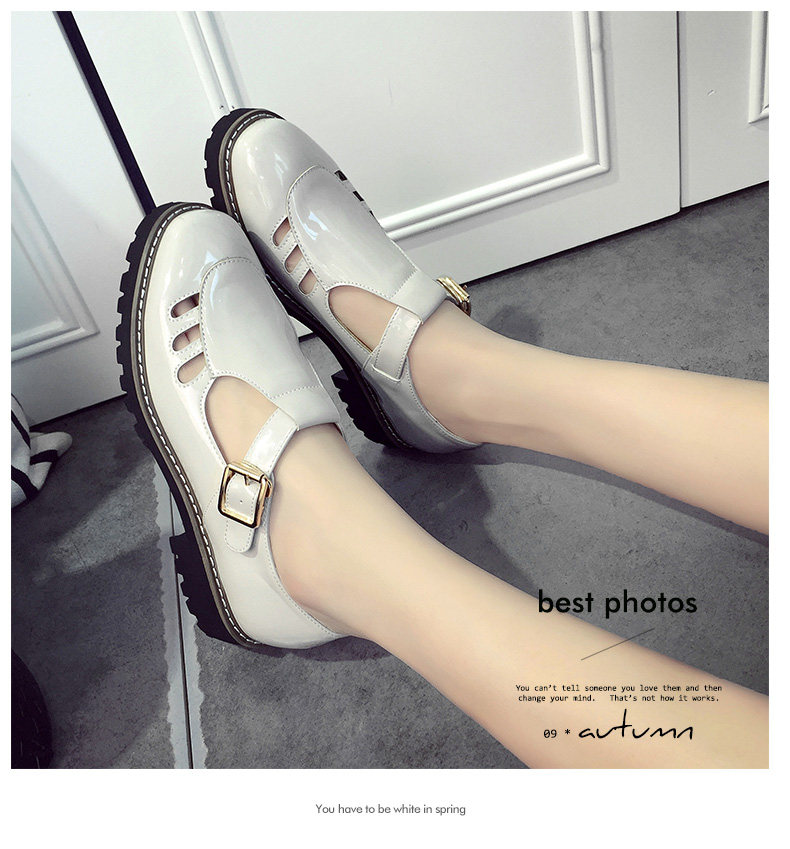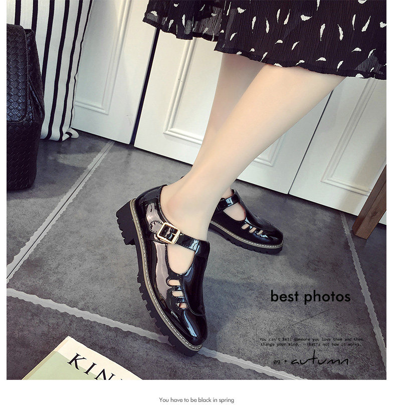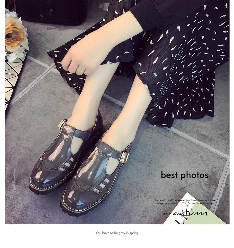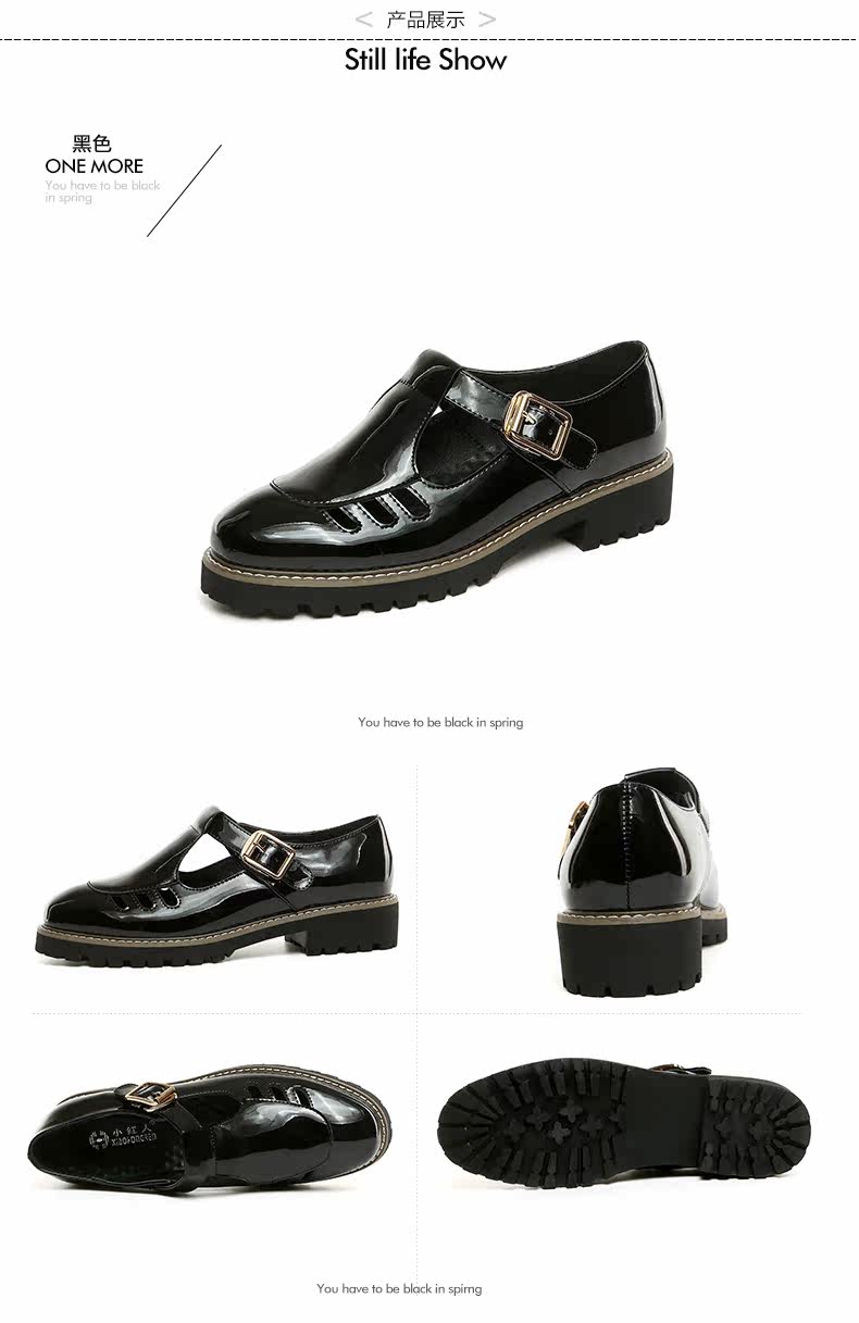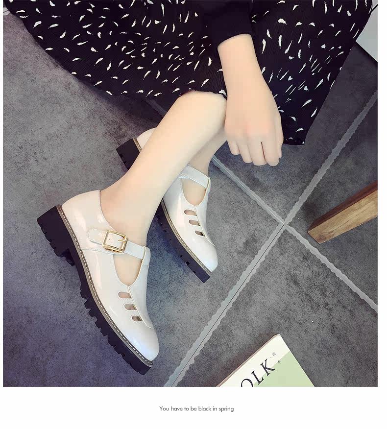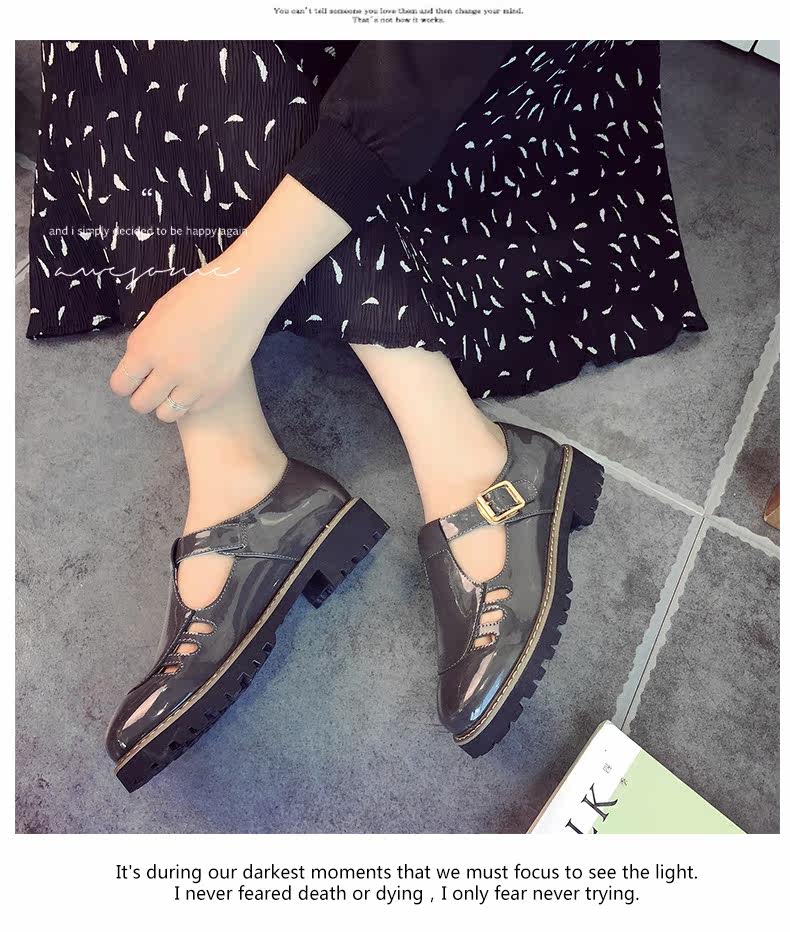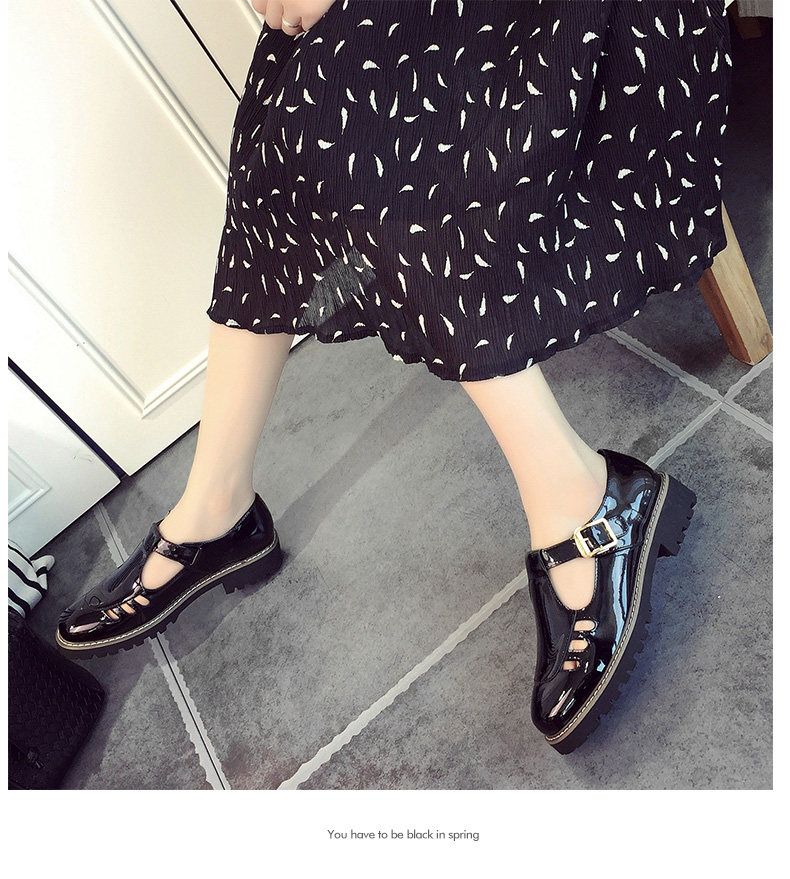 春季韩版漆皮单鞋女平底英伦搭扣玛丽珍鞋粗跟镂空休闲鞋女