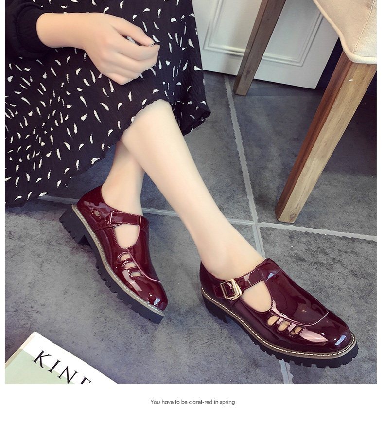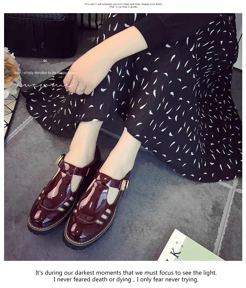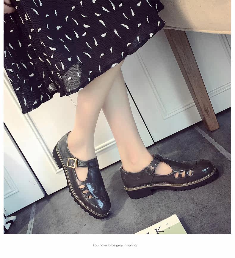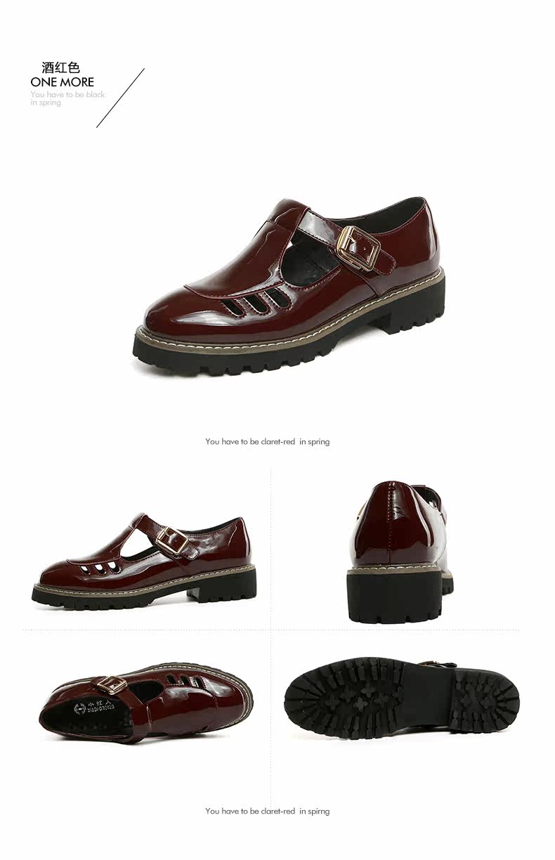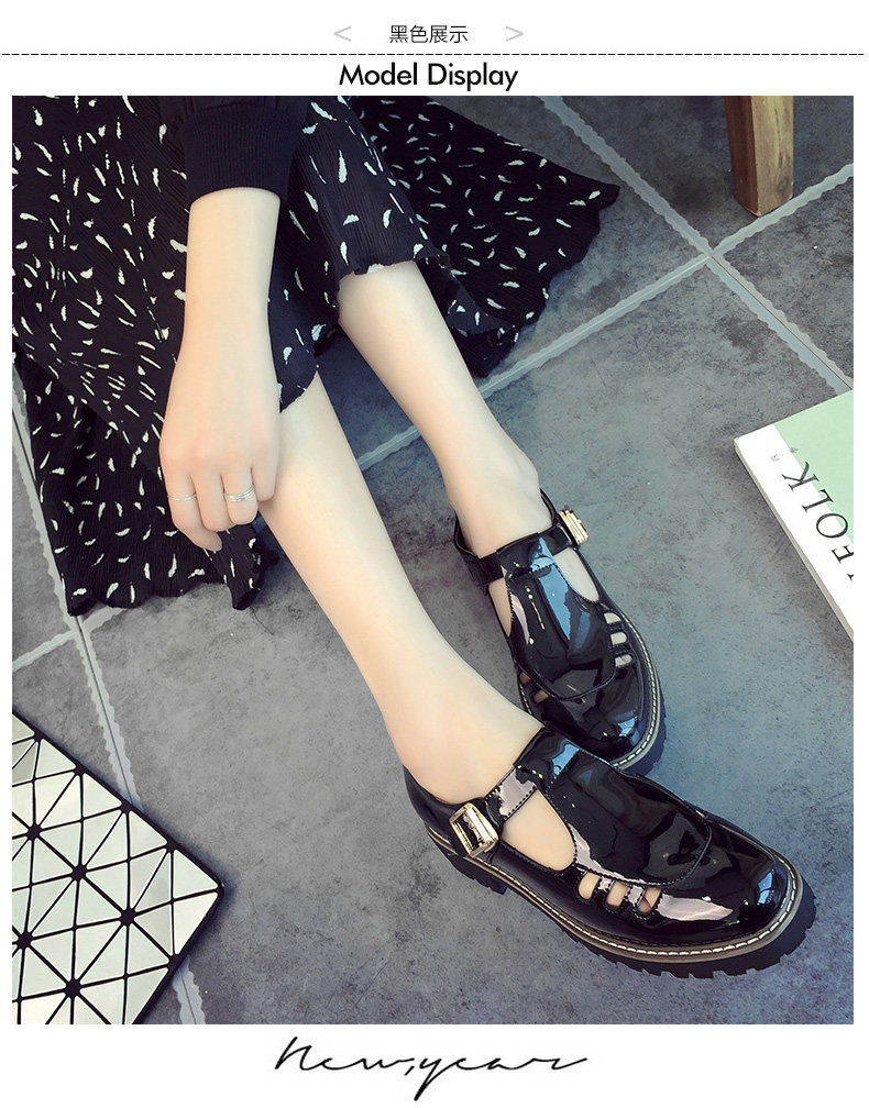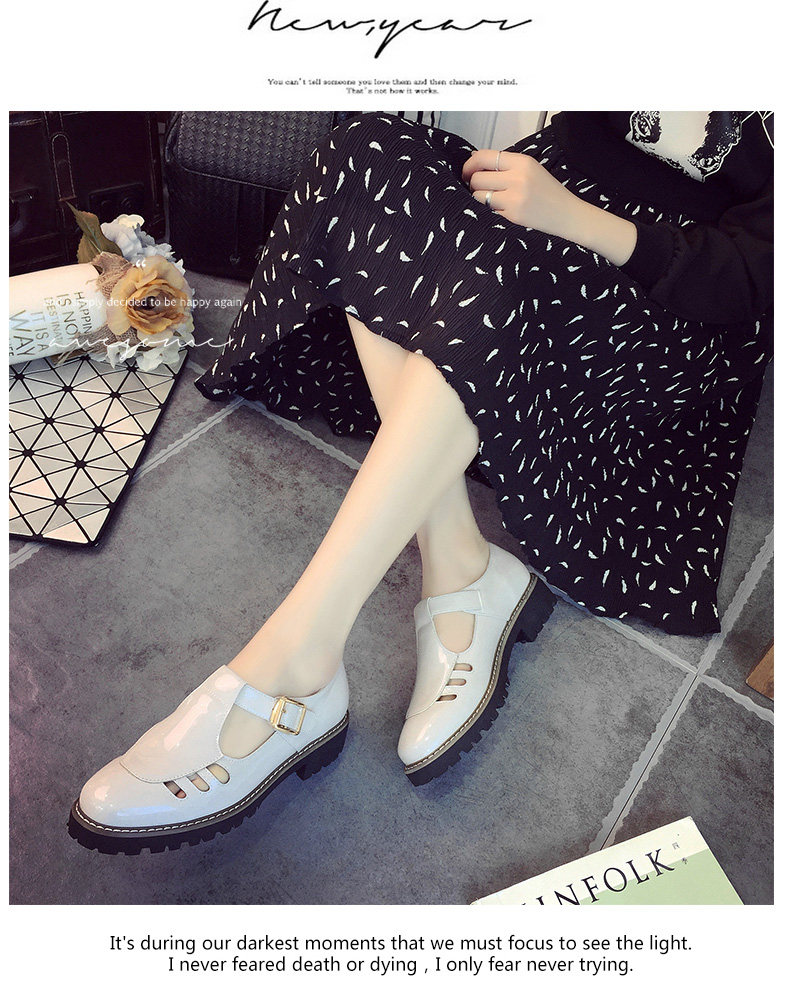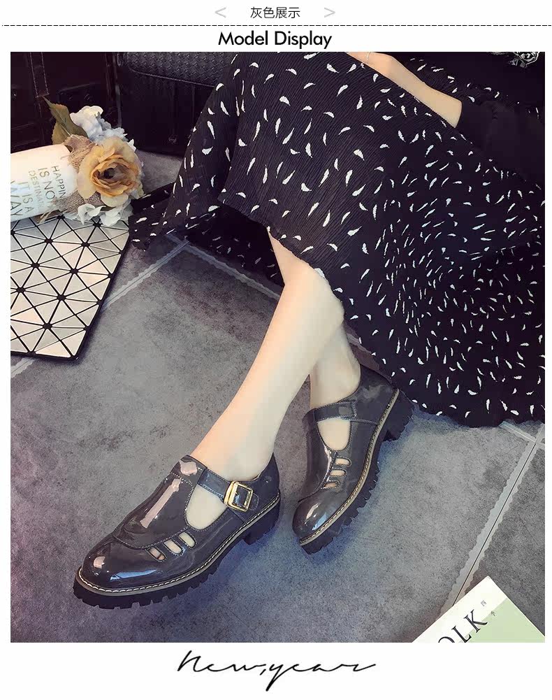春季韩版漆皮单鞋女平底英伦搭扣玛丽珍鞋粗跟镂空休闲鞋女