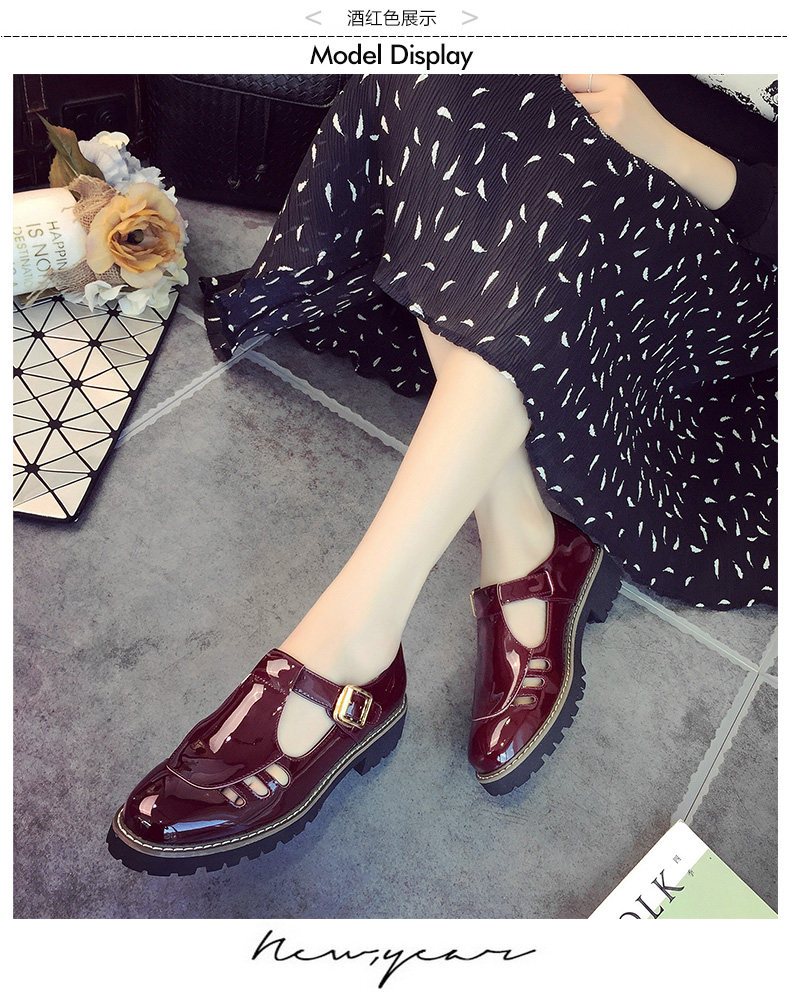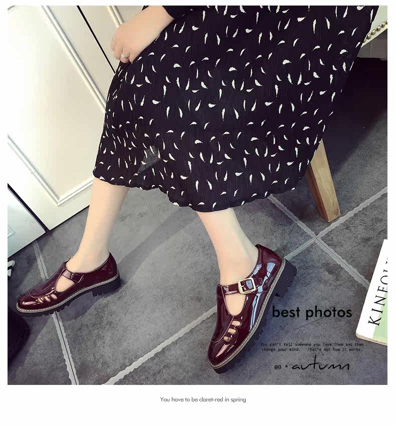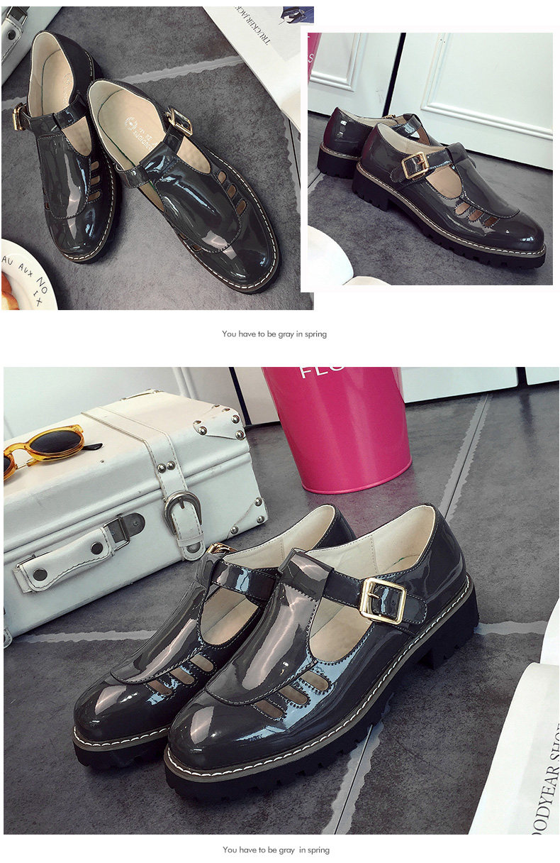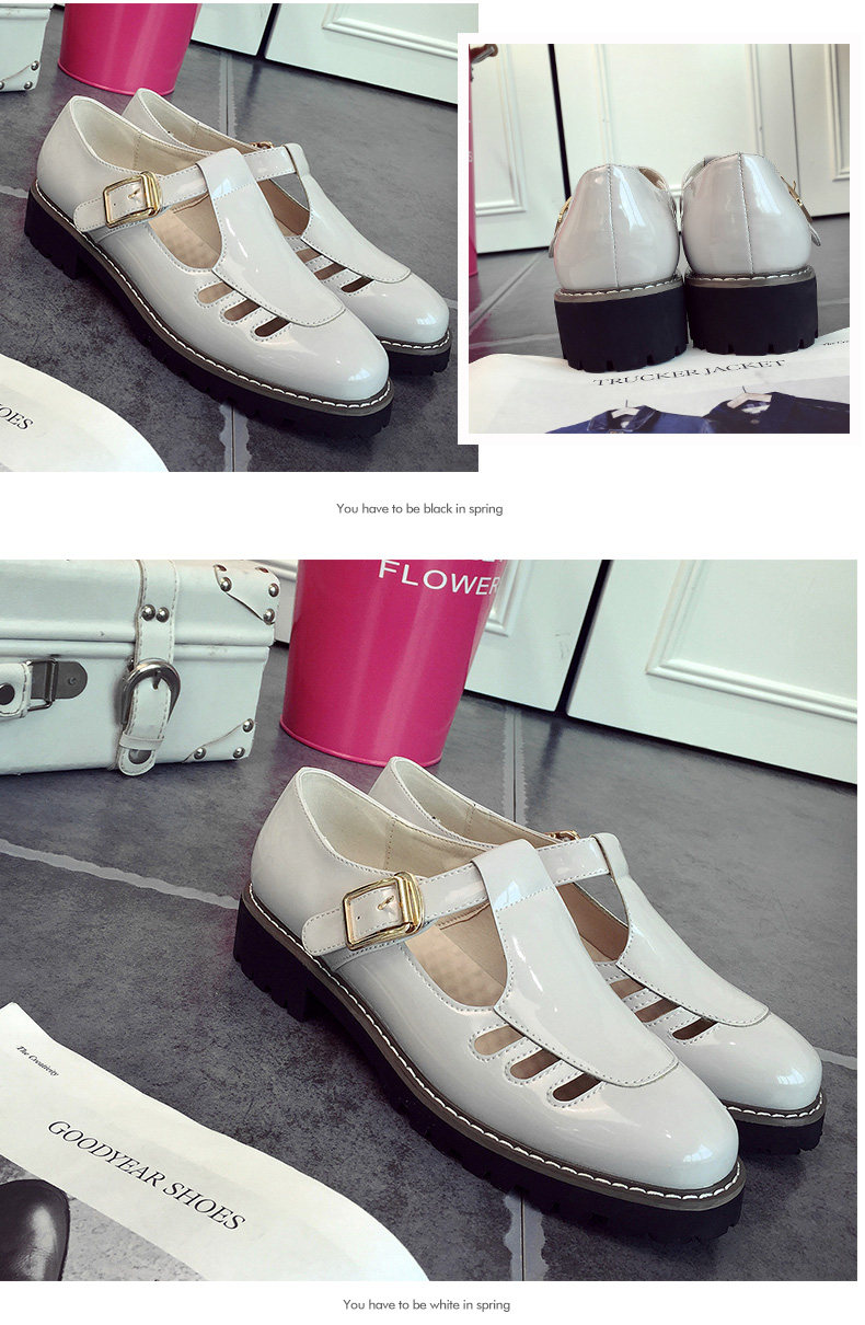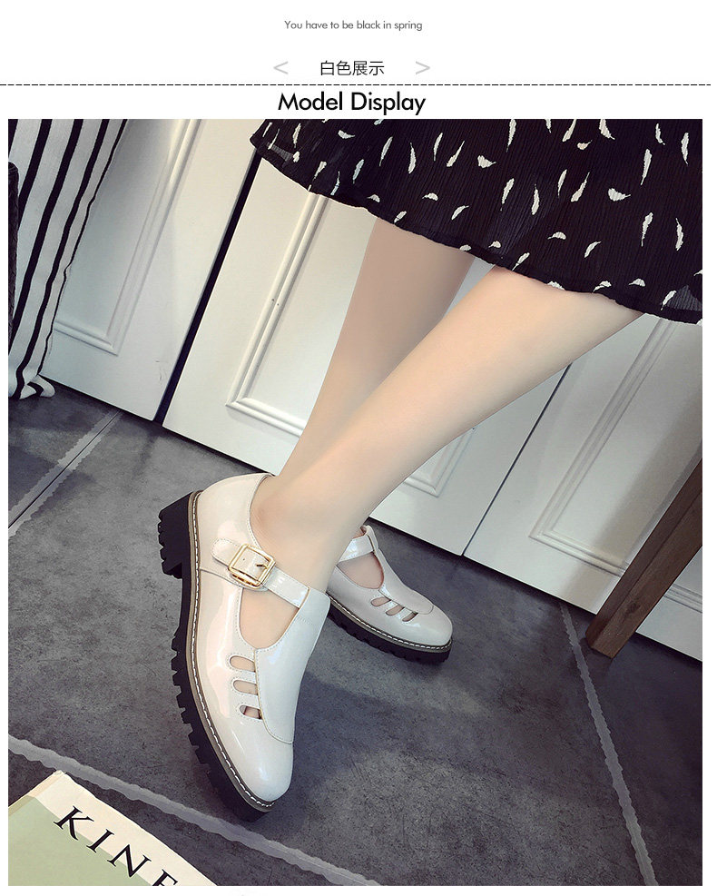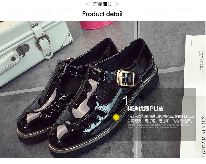 春季韩版漆皮单鞋女平底英伦搭扣玛丽珍鞋粗跟镂空休闲鞋女