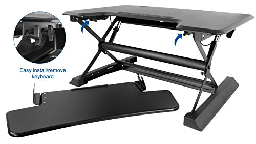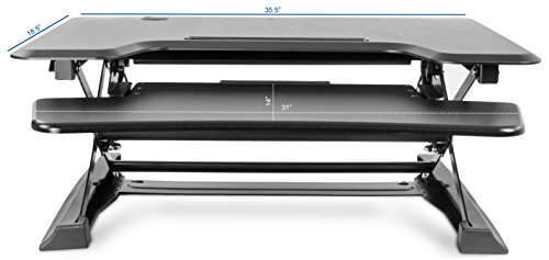 -. Binding : Office Product -. Brand : VIVO -. Color : Black -. EAN : 0818538020854 -. Feature : SIT TO STAND CONVERTER- Manual adjustable workstation allows you to find that needed healthy balance between sitting and standing throughout the day / QUICK TRANSITION - Go from sitting to standing at the squeeze of a lever with gas sP.R.Ing height adjustment. Adjust to your proper comfort level by using the gas sP.R.Ing height locking mechanism (adjustable range: 4" to 20") / SPACIOUS WORK AREA - The top surface measures 36" x 23" providing plenty of space for single monitor, dual monitor, and laptop + monitor setups. Customize your work area and create the workflow you need / DUAL TIER - The lower 31" x 14" tray holds keyboard and mouse side by side and raises in sync with the top surface creating a comfortable work space. Weight capacity is 33 pounds for the top surface and 6.6 pounds for the keyboard shelf / SIMPLE ASSEMBLY - Very minimal assembly out of the box! Place on your existing desk and start organizing your workstation -. Label : VIVO -. Manufacturer : VIVO -. Model : DESK-V000ZB -. MPN : DESK-V000ZB -. PackageQuantity : 1 -. PartNumber : DESK-V000ZB -. ProductGroup : Office Product -. ProductTypeName : OFFICE_PRODUCTS -. Publisher : VIVO -. Studio : VIVO -. Title : VIVO Black Height Adjustable 36" Wide Standing Desk Sit to Stand Tabletop Computer Monitor Riser Converter (DESK-V000ZB) -. UPC : 818538020854