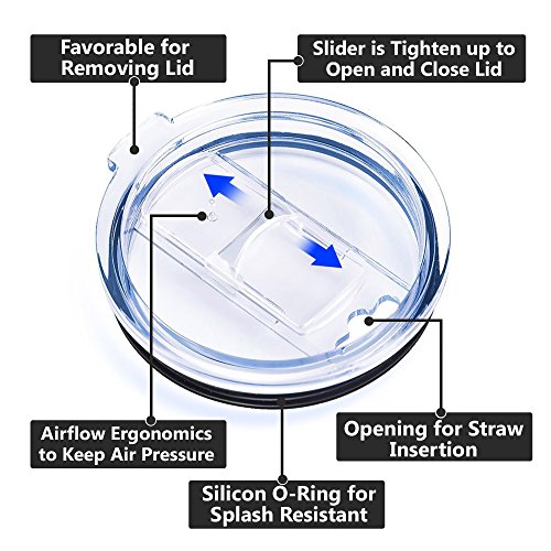 -- Fits the RTIC/YETI/BOSS/OZARK/SIC Other vacuum insulated Stainless Steel 20 oz Tumblers. -- Made of tough, thick, BPA free durable crystal clear plastic and is dishwasher safe. -- Designed with sliding cover to help prevent splash and keeps drink insulated longer. -- No need for wire and plug. Allows for easy installation and convenient usage. -- Contoured drink hole allows for direct sipping or straw use. -- Keeps bugs and debris out of your drink. -- It's especially helpful when having hot drink in the mug or tumbler. No more worry about scald. -- Perfect for those rough boat rides, off roading, ATV and other extreme activities. the sliding closure helps resists spills and is straw friendly. Package Inclusion 2 x Spill Resistant Splash Resistant Lid for 20 oz Yeti Rambler Tumbler. 0
