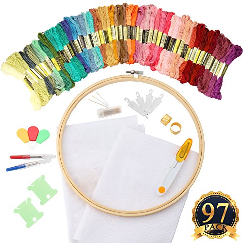 - Package Content: 50 Color Threads, 30 Pcs 3 sizes embroidery needles, 7 Pcs cross stitch needle-threading tools, 2 Pcs 14 count white cotton classic reserve aida, 2 Pcs thimble, 2 Pcs untwist tool, 2 winding board, 1Pcs bamboo embroidery hoop, 1 pair of scissors.