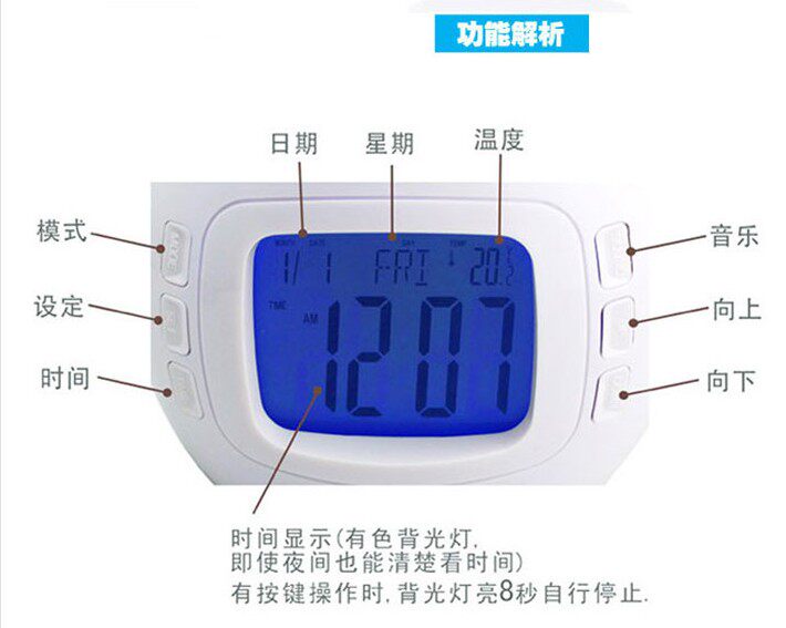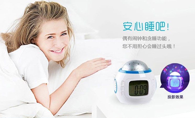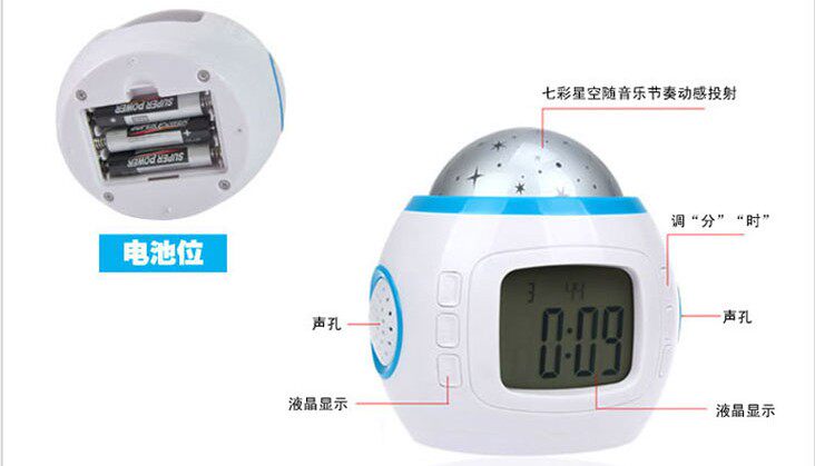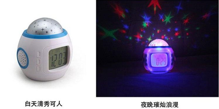 音乐星空万年历,顾名思义拥有日历时钟、星空灯效果、音乐效果,小小东西既然有这么多功能,真是物美价廉,此乃送人之佳品也!该钟按任意键,它会点亮小夜灯效果,方便夜晚观看哦!