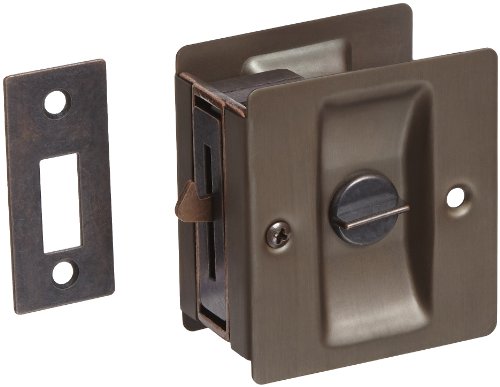-. Feature : Brass pocket door P.R.Ivacy latch has a satin oxidized oil rubbed bronze finish and is for use on 1-3/8" and 1-3/4" doors / Turn piece locks to jamb strike and includes emergency release on opposite side / Measures 2-3/4" high x 2-1/2" wide / Meets ANSI A156.14: D0831 specifications / Includes mounting hardware