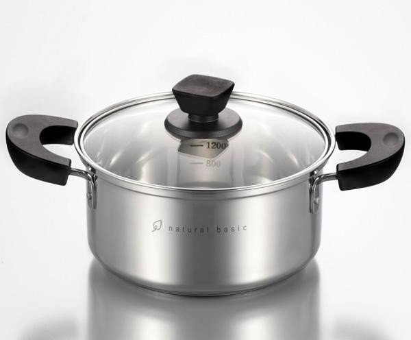 | 素材・材質 | 本体/18-8ステンレス(底厚0.5mm) 底部(底厚合計3.0mm)/アルミニウム(板厚2.0mm)、18-0ステンレス鋼(板厚0.5mm) 蓋/強化ガラス 取っ手・つまみ/フェノール樹脂 |