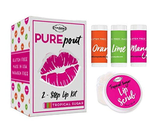 PURELY Perfect Pout - a handcrafted, natural ingredient 2 Step Kit for lips. Includes delicious exfoliating Tropical Sugar Lip Scrub (.75 oz) & 3 flavors - Orange Honey, Lime Sugar and Mango Coconut - of healing Mini Lip Butters (.15 oz). 100% Gluten Free Naturally smooth lips - taste the differenceFeature
