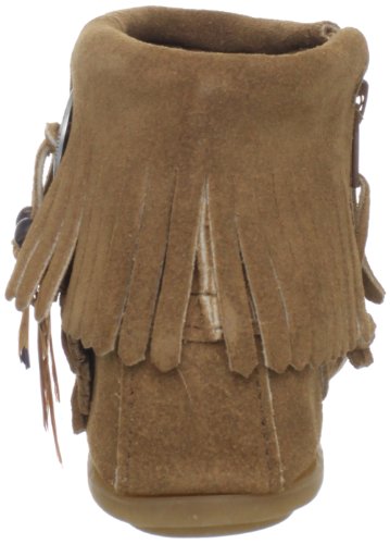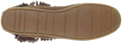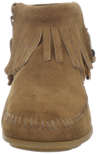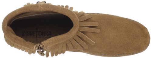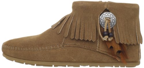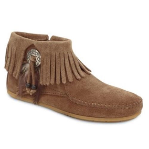 A casual moccasinfor everyday wear! Our Minnetonka lady'€™s moccasin features a silver-tone concho with feathers and beads at the side. This pair of soft sole suede back-zip moccasins have fringe cuff at the ankle and a corded zipper pull on the back. As an authorized retailer of Minnetonka Moccasin products, we cannot accept orders from outside the United States for Minnetonka products. We are very sorry for any inconvenience this may cause you.Feature