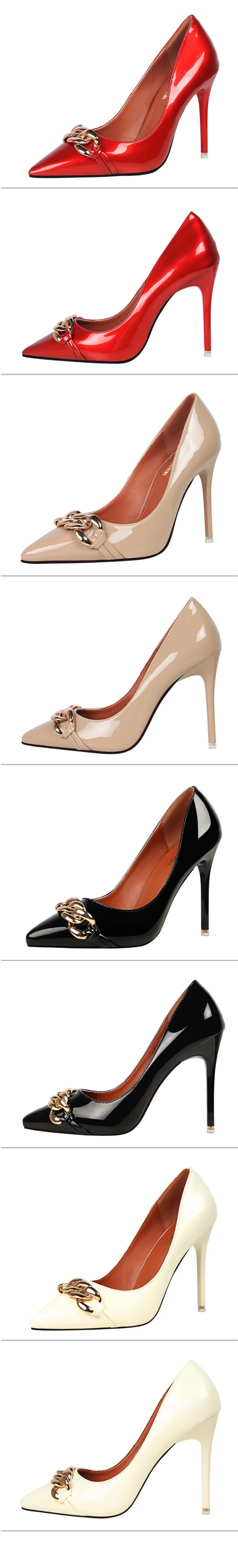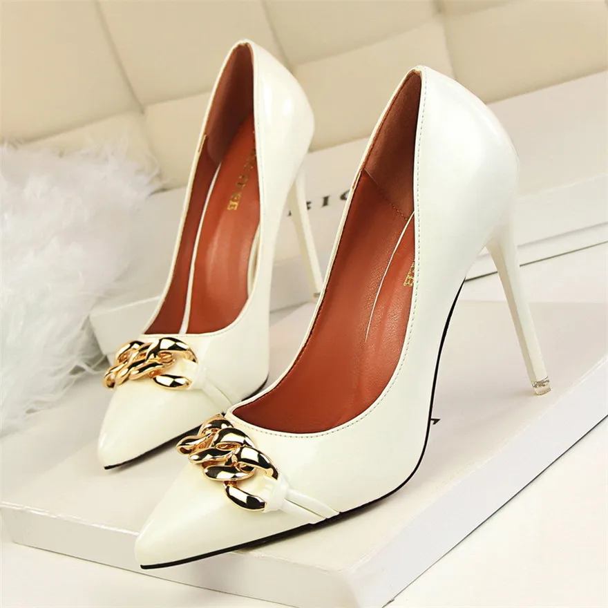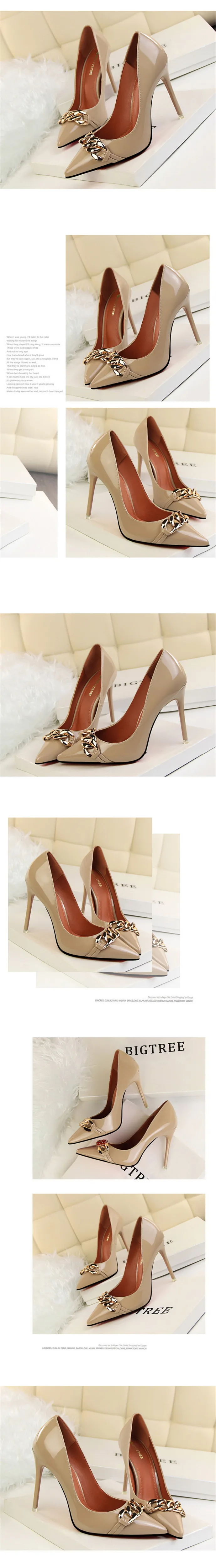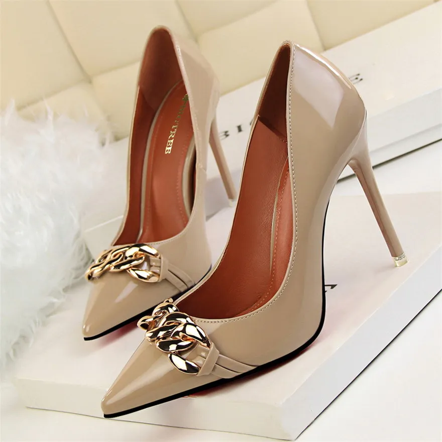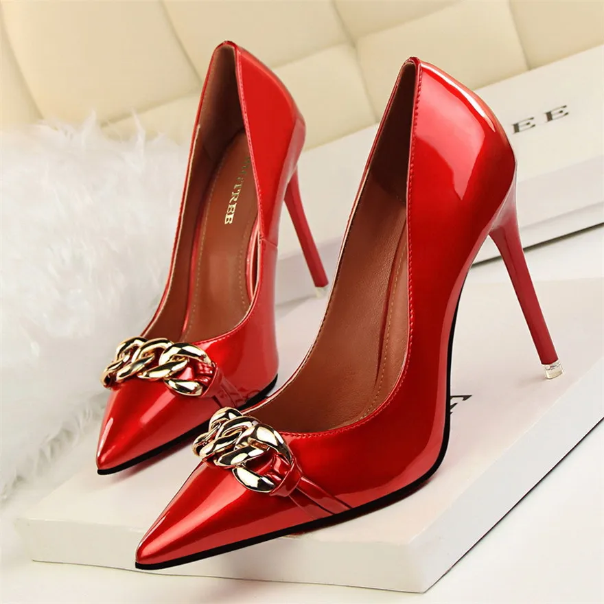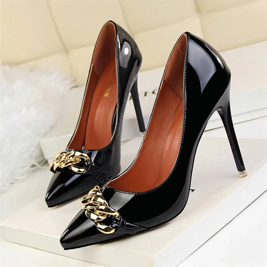 Item:Women's Pointed Toe Patent Leather Fashion Metal Chain Shallow Shoes