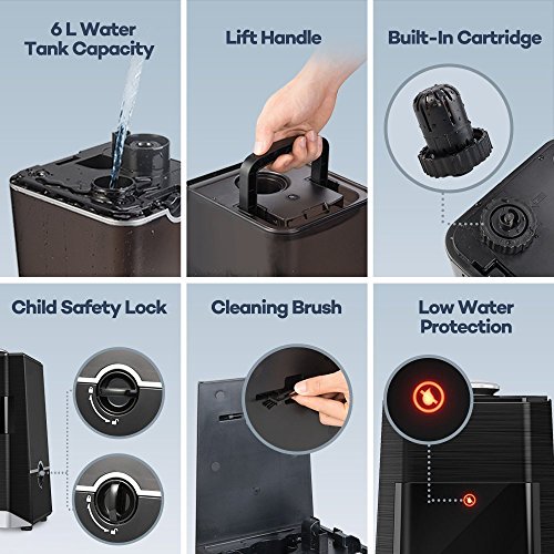 Long-Lasting 6 L Capacity Enjoy long working hours with just one refill thanks to the huge 6 L water tank the humidifier comes with. The built-in low water safeguard will interrupt the mist flow when the water level is low so that you get to fully relax without having to worry about it.