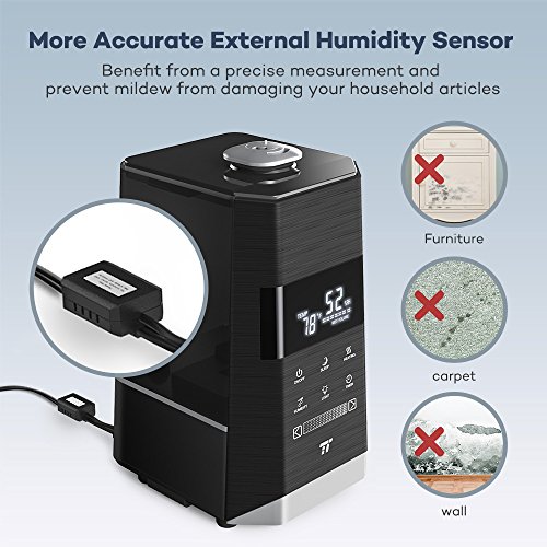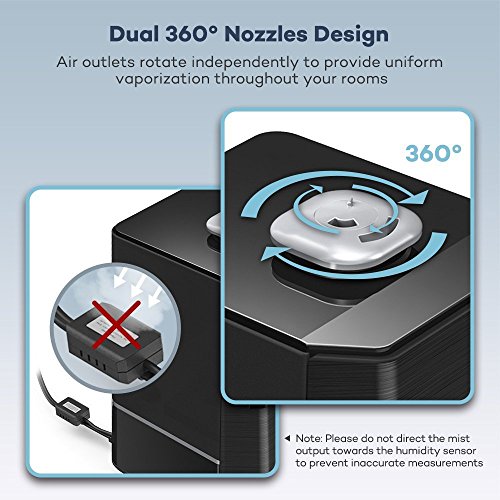 Dual 360° Nozzles Design To provide a uniform vaporization throughout your rooms, this humidifier features a set of 2 x nozzles that rotate independently up to 360°. The innovative, external humidity sensor guarantees a more precise reading so that the vaporization will stop when needed to and won't damage your furniture. (NOTE: Please do not direct the mist output towards the humidity sensor to prevent inaccurate measurements)