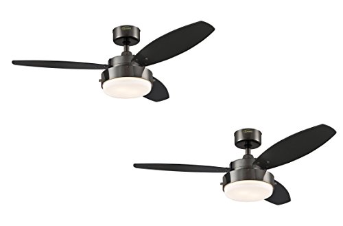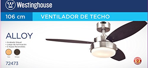 Add modern refinement to your home with the Westinghouse Alloy Two-Light 42-Inch Reversible Three-Blade Ceiling Fan. The brushed nickel finish and opal frosted glass fixture have a sleek, modern look, while the beech/wengue reversible blades make it easy to match your decor.