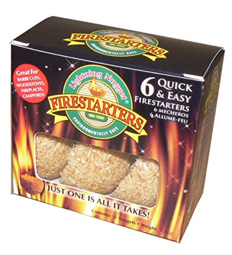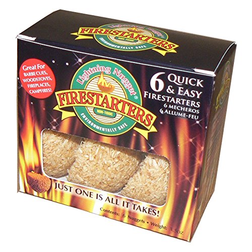 Studio : Lightning Nuggets INC Publisher : Lightning Nuggets INC Product Description Lightning Nuggets Firestarters come in a handy 6 pack box. Lightning Nugget Firestarters are the answer to one step no-hassle fire building. Comprised of one of nature's by-products, pitchwood, this unique product is top of the line in quality, safety and convenience. Free from any harmful chemicals, Lightning Nugget Firestarters are safe for use in any wood burning appliance and leave no residue. Eliminates messy liquids and gels, with no more guessing about how much to use. Once you have experienced the ease and effectiveness of these firestarters you'll love making a fire!.NON -TOXIC ENVIRONMENTALLY SAFE.MADE IN THE USA.Burn Time - 15 minutes (approximately).Dimensions - 2"x1.25".Weight - .6 oz ea.Total Weight - 3.5 oz. 0