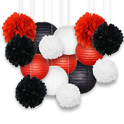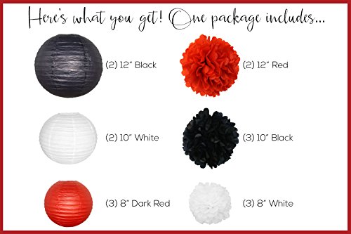 - 15 PIECE ASSORTED SIZE/COLOR SET INCLUDES: Three (3) of each; 8-inch Dark Red Paper Lanterns, 10-inch Black Pom Poms, 8-inch White Pom Poms and Two (2) of each; 12-inch Black Paper Lanterns, 10-inch White Paper Lanterns, 12-inch Red Pom Poms for a total of 15 individual pieces.