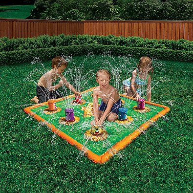 -. Binding : Baby Product -. Feature : For children 3 years and up / Stomp the water-filled gophers and see where water will shoot out next / Mat features 8 gophers / Plastic/PVC construction / Your child will stay cool while having fun on the Banzai Smash N' Splash Gopher Field Play Mat -. IsAdultProduct : 0 -. Label : Banzai -. Manufacturer : Banzai -. ProductGroup : Baby Product -. ProductTypeName : BABY_PRODUCT -. Publisher : Banzai -. Studio : Banzai -. Title : 35" L x 35" W x 9.75" H Banzai Smash 'N Splash Gopher Field Water Mat