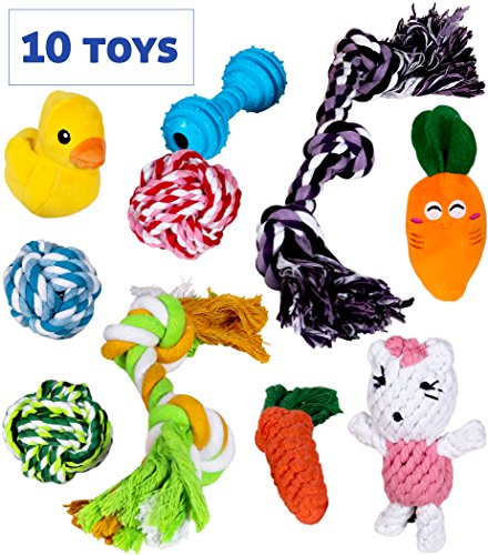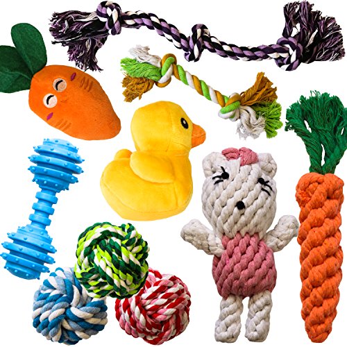 Product Description Dog toy set by AMZpets - 10 pcs. Set includes the following teething toys: 2 Animal Plush toys, 2 Chewing ropes, 2 rope doll toys, 3 rope balls, 1 plastic rubber bone carrying bag with straps 0