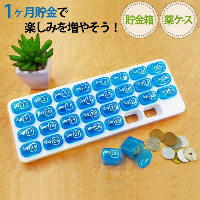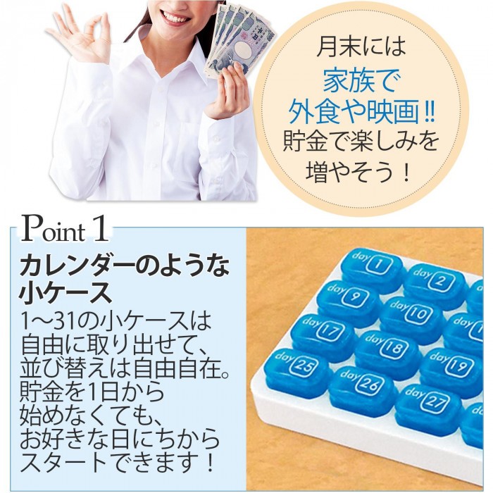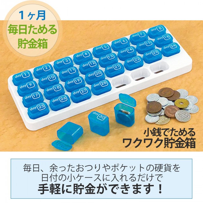 | 毎日、余ったおつりやポケットの小銭で手軽に貯金ができる、小銭でためるワクワク貯金箱。カレンダーのような1~31の小ケースは自由に取り出せて、並び替えも自由自在!貯金を1日から始めなくてもお好きな日にちに並び替えてスタートできます。また、毎日の飲み忘れを防ぐ薬ケースとしても使用できます。コインバンク/ピルケース/サプリメントケース |