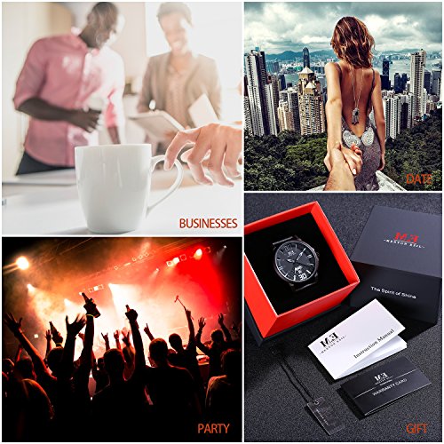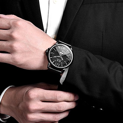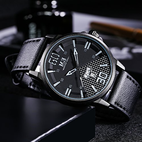 -. Feature : DURABLE CASUAL BUSSINESS and SPORTS DESIGN: Combine business casual and sport with classic Black and White color, unique Date and Week Window Phase and leather watch band, bring you back to the classic and simplicity. Also make it a great gift for family or friends / COMFORTABLE ADJUSTABLE LEATHER BAND STRAP: High quality black Genuine Leather band with Buckle provide comfortable wearing experience and convenient to adjust the wirst, fits for all wrist sizes / PRECISE TIME KEEPING: Japanese Quartz Movement provides precise and accurate time keeping.High hardness mineral glass to protect the watch face / WATERPROOF TO 30M: Support to swim and bathe in cold water. Excellent shockproof and anti-frost performance, suitable for all kinds of sports and outdoor activities / GIFT PACKAGE: 1x Menton Ezil Mens Sport Watch, 1x Classic Watch Box, 1x Watch Operation Insrtuction. A perfect present for father,grandfather,boyfriends,husband,boys or yourself on Father's Day, Christmas, Birthday, Anniversary, Valentines Day