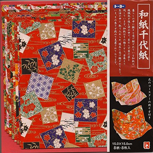 -. Feature : 6" (15 cm) square Red Washi paper / 8 different patterns / 1 sheet each pattern / 24 sheets total / Made in Japan