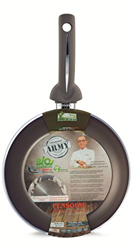 Saute vegetables, fry up some eggs or cook tender meats using little or no fat with this non-stick jumbo fry pan from Pensofal Italian Cookware. Featuring Bioceramix, a new and special non-stick coating exclusive to Pensofal technology make your favorite recipes healthier by cooking with the benefits of non-stick cookware. Composed of several layers of non-stick coating with a ceramic base reinforcement creating a compact film, always smooth and completely impermeable. Bioceramix has no PFOAs and is lead-free. The patented inbox double bottom is anti-warp, anti-skid and allows for even heat distribution; suitable for all cooking applications including induction. The fry pan is treated with a non-stick layer inside and out making for easy cleanup and is dishwasher safe. The Bakelite handle is designed for comfort and a safer grip. The high non-stick performance is recognized by international cooks and tested by specialized Institutes throughout the world and comes with a five year guarantee. Made in Italy. Glass lid with aroma knob is sold separately under item number 07PEN9364.Feature