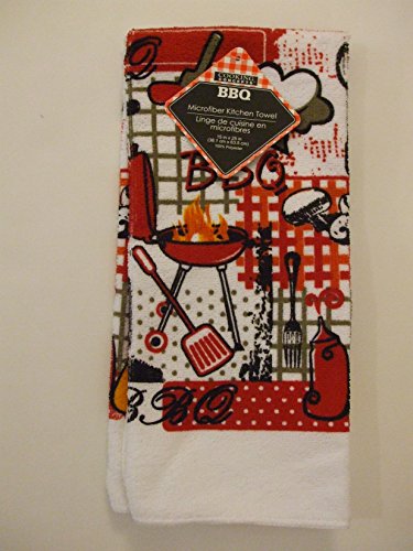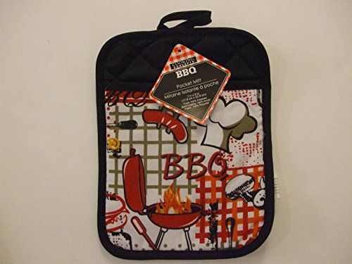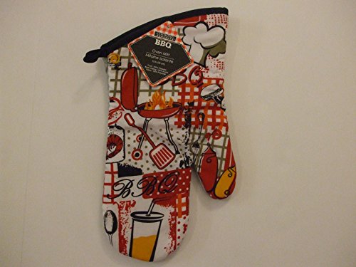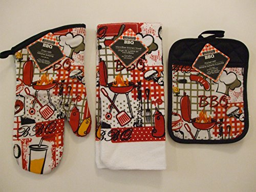 Barbeque BBQ Hot Mitt Potholder Bundle - 3 Items: Oven Mitt, Pocket Mitt, Microfiber Kitchen Towel - Red & White Food Accessory Pattern