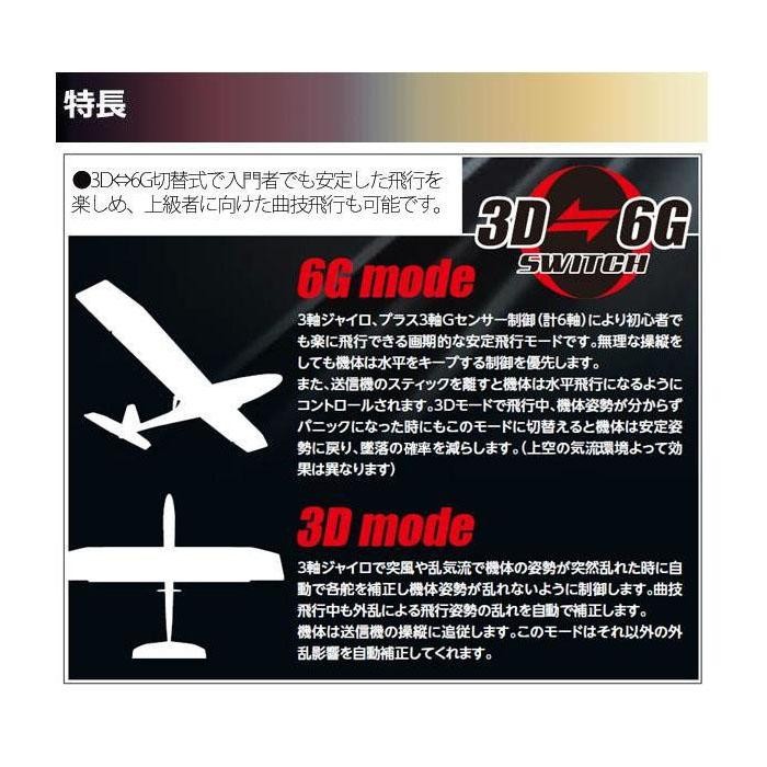 | 3D⇔6G切替式でビギナーの方でも操作しやすく、入門者から上級者まで思いのままにフライト♪驚異的な安定性と曲技性能を切替飛行可能です。双葉電子工業(株)様S-FHSS互換プロトコル採用。今、お手持ちのフタバ送信機でのフライトが可能になります。 |