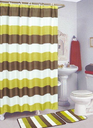 -. Feature : 15 Designer Bathroom Set / 2 Bath rugs: 1-18" x 29.5" (46cm x 75cm) Bath Mat, 1-18" x 18" (46cm x 46cm) Contour Rug / 1-Fabric Shower Curtain (72" x 72"), 12-Matching Fabric Covered Shower Rings / Durable and Easy to Clean / Rubber Backing on Mats