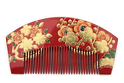 -. Title : 簪 前櫛 赤 レッド 金色 梅 桜 花 松 ラメ 蒔絵調 手描き レトロモダン 十三参り 七五三向き 成人式向き 振袖向き 和髪 髪飾り くし ヘアアクセサリー