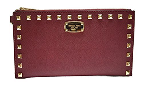 MICHAEL MICHAEL KORS SINDRINE STUDDED SAFIANO LEATHER ZIP LARGE CLUTCH, WRISTLET PLUM
