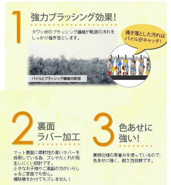 重厚のあるパイル繊維が砂・塵・水分をしっかりキャッチ!靴裏の汚れを強力に掻き出し、高密度なパイルの中に取り込んで表の汚れを目立たなくします。マット裏面に柔軟性の高いラバーを採用、ズレやたくれが発生しにくい設計です。水洗い、デッキブラシ洗浄など、ご家庭で簡単にお手入れできます♪ |