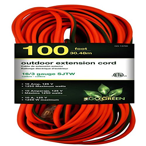 The GoGreen Power 25' 16/3 SJTW extension cord will resist moisture, abrasion and prolonged exposure to sunlight for durability. Cord has heavy duty molded plugs and lighted green end to show power is on. Great for use around your garage and with other outdoor electrical devices.Feature