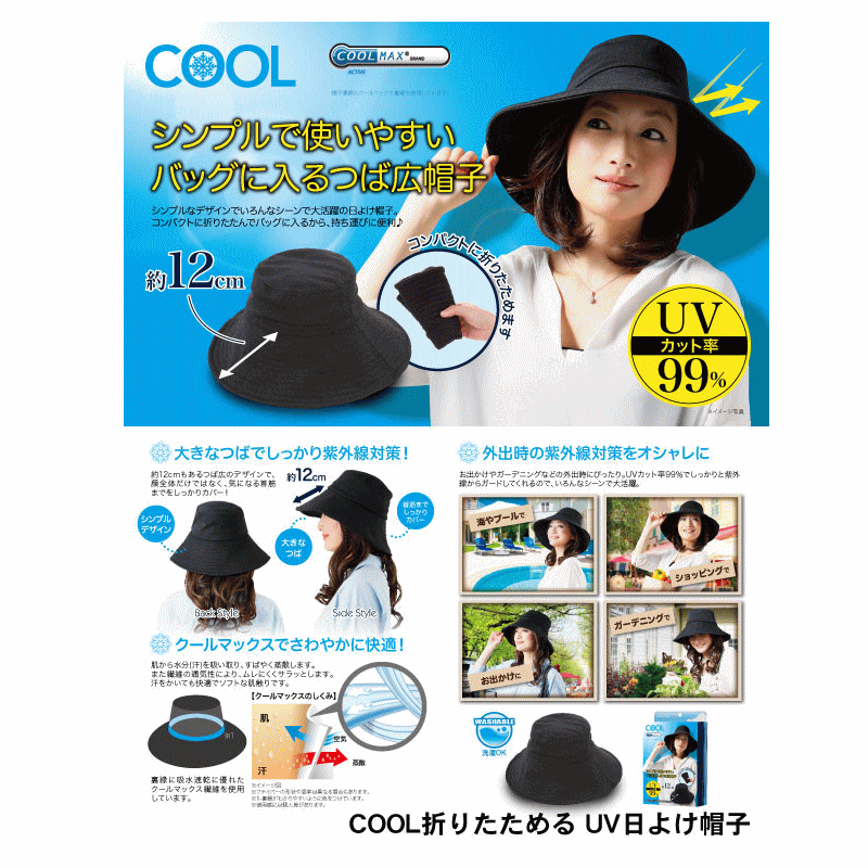 ■外出時の紫外線対策にクールで折りたためるUV帽子■商品情報(状態)   未開封品  (サイズ)頭囲:約57.5cm(注意事項) ・強風時の使用および自転車等にお乗りの際は、帽子が飛ぶおそれがありますのでご注意下さい。・お肌に合わない場合や、かぶれ・かゆみ等を感じた場合はご使用をおやめください。・本品は折りたたんで梱包しているため、折り目がついている場合がありますが、ご使用していくうちになくなります。・乳幼児のての届かない所に置いて下さい。・火気のそばや高温多湿な場所極端、高温又は低音の場所や直射日光のあたる場所には保管しないで下さい。・印刷の都合上、実際の商品と多少色が異なる場合があります。