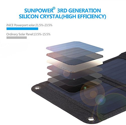 High Efficiency: Equipped with Sunpower 3rd generation silicon crystal solar cells,increase up to 21.5-23.5% conversion efficiency,providing enough power to charge two devices simultaneously.