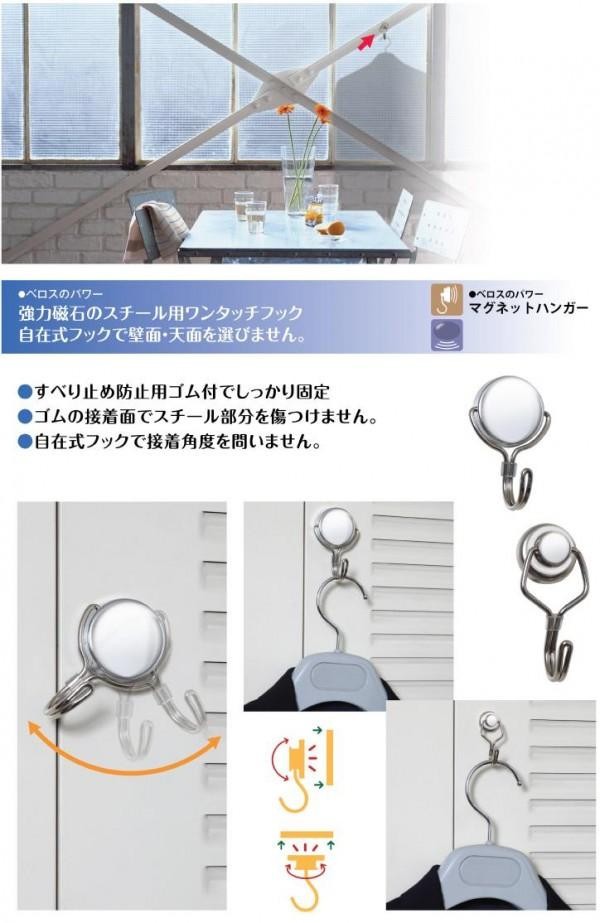 | 強力磁石で天井面にも取付けOK!上下可動式360度回転フックです。強力スベリ止めシート付きで傷つけません。 |